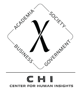 Our centre logo prominently features the Greek letter chi that is similar to the acronym for the Centre for Human Insights (CHI). The Greek letter chi sits within a square that has the words – Academia, Business, Government, and Society on its edges. These are the four domains in which the centre seeks to operate in. CHI will be a common platform that brings together experts from all of the four domains.